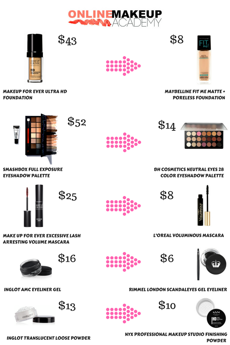 Here are the list of ‘Drugstore Dupe’ Makeup Kit products which you can substitute with our brand name exclusive Online Makeup Academy Professional Makeup Kit: