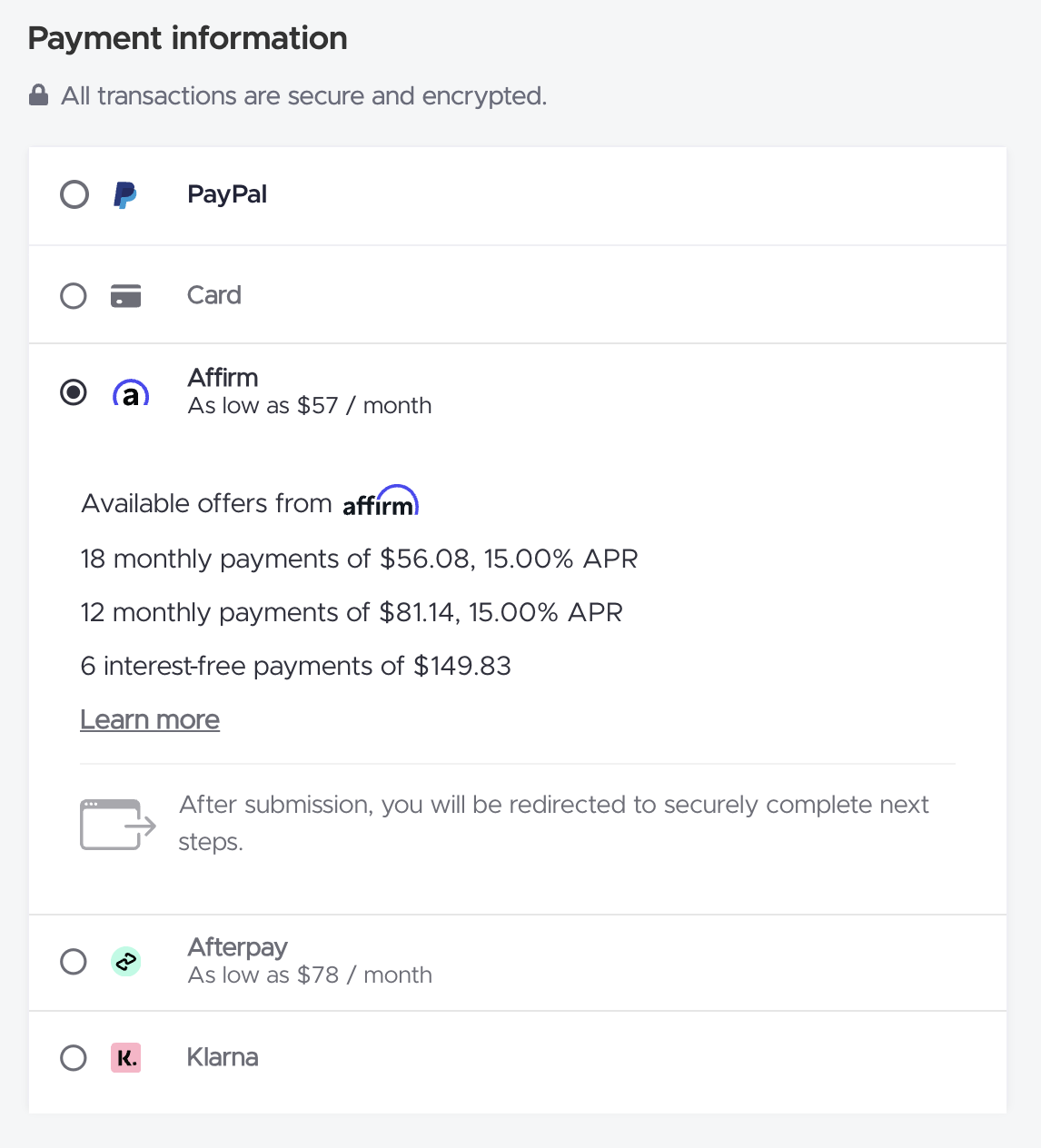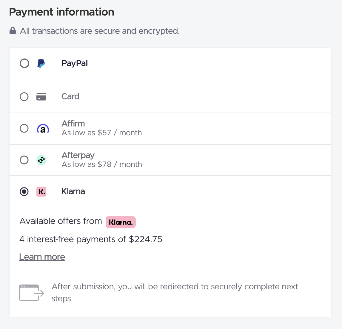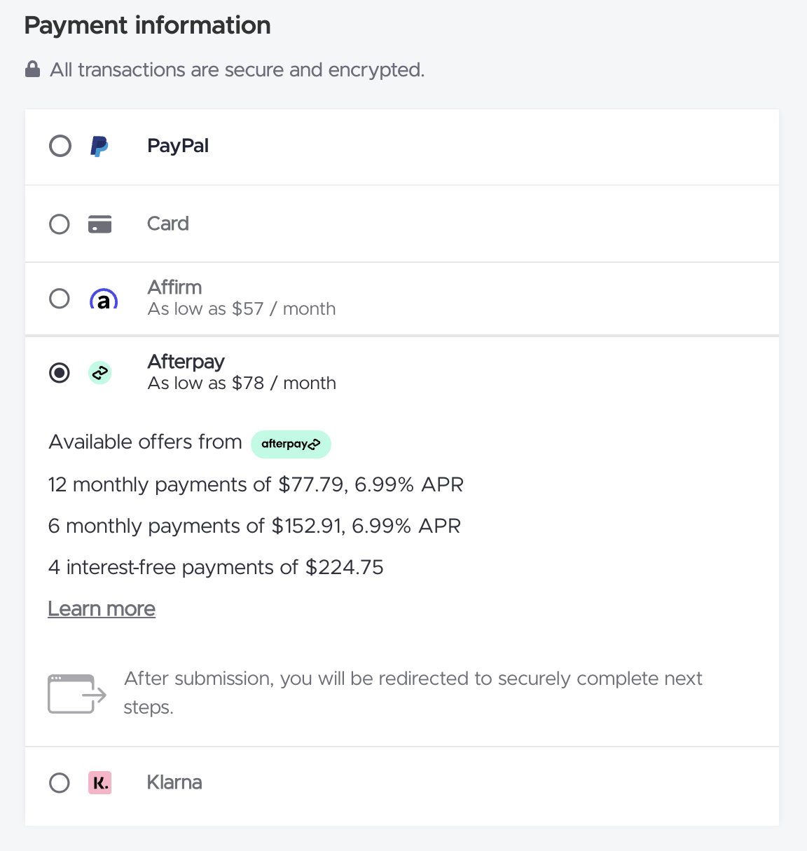 Under the Payment Information section, choose Buy Now Pay Later option that you prefer.